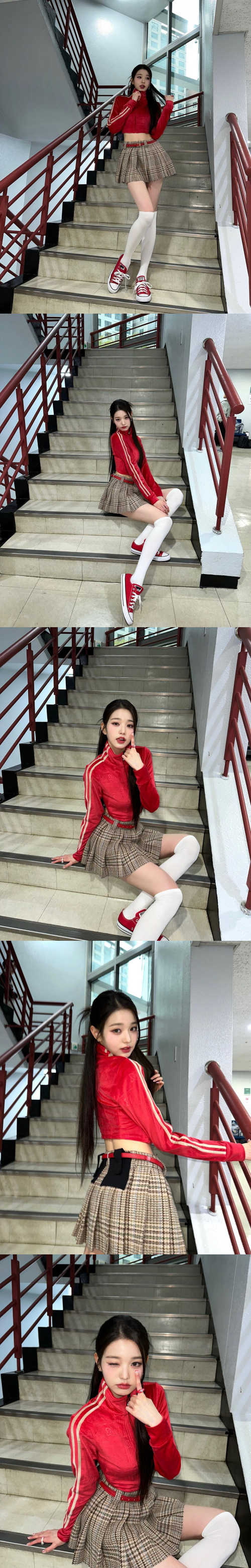 写真には、ミニ丈の赤いパーカーにチェックのミニスカート、そして白いニーハイソックスを合わせたウォニョンの姿が。ウィンクや振り向きSHOT、そして上目遣いまで、コロコロ変わる表情でファンを虜にした。