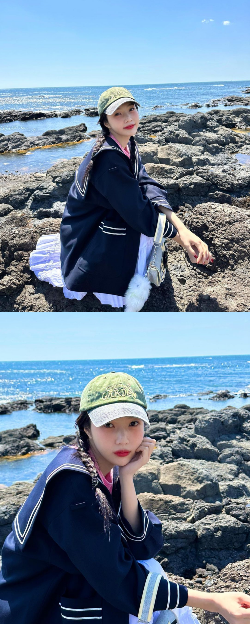 また、同じ時間に投稿されたインスタグラムには海で撮った写真が。少し寒いのかセーラーカラージャケットを羽織っており、三つ編みと相まって少女のような愛らしさを発揮した。