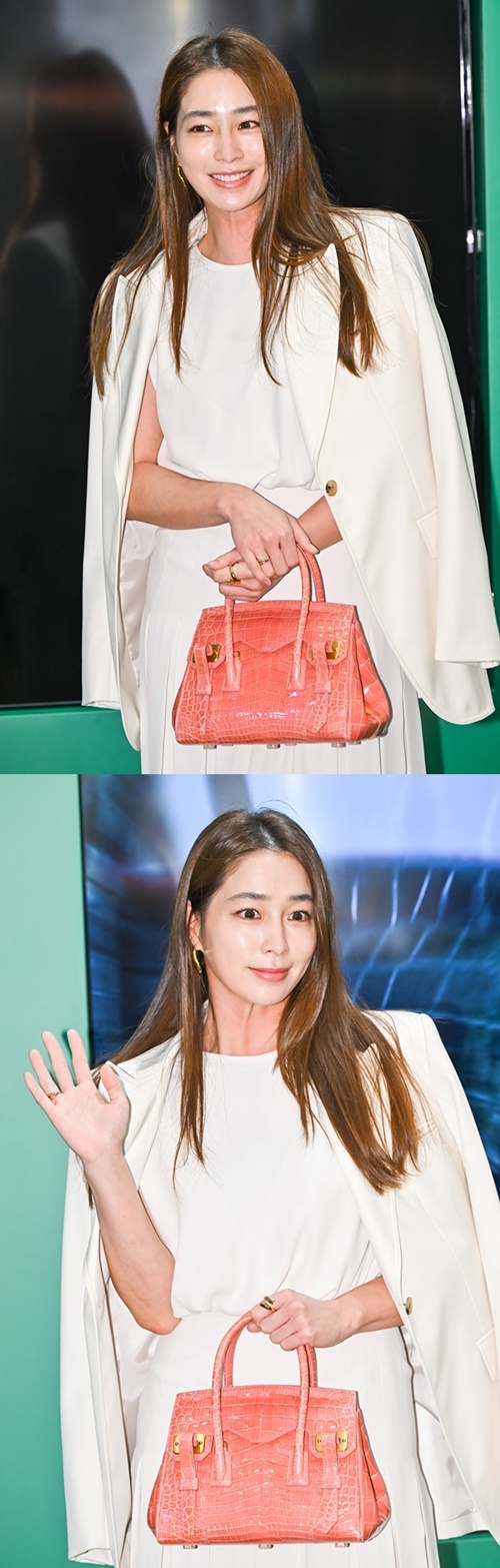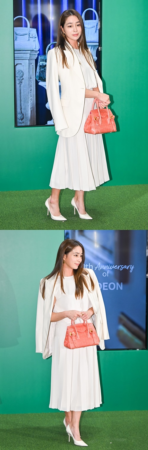 同ブランドのバッグを手に笑顔を見せたイ・ミンジョン。コーラルオレンジのカラーはコーディネートの絶妙なアクセントとなり、軽やかさの中にも大人の女性の品格を感じさせるスプリング・ルックを完成させている。