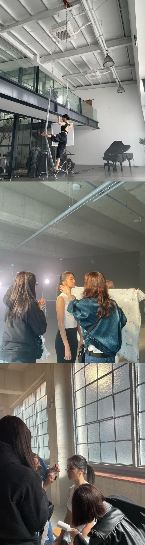 写真には、トレーニングウェアを着たパク・ハソンの後ろ姿が。普段から鍛えていることがよくわかるように、ぱっくり開いたトップスからは背中のラインがあらわになっている。また、別の写真ではスタッフに化粧や髪を直される姿が写され、何かの撮影であることがわかる。洗練された横顔が相変わらず美しい。