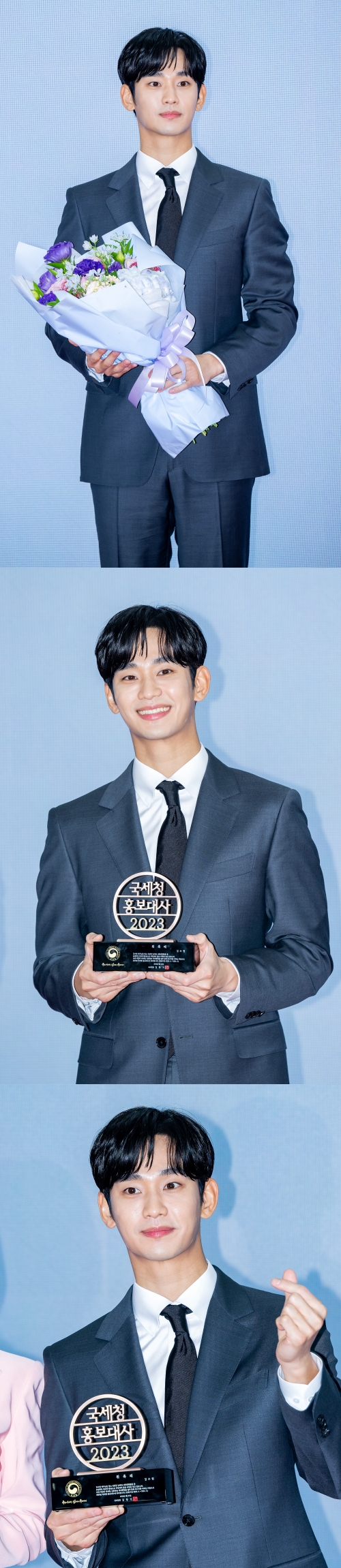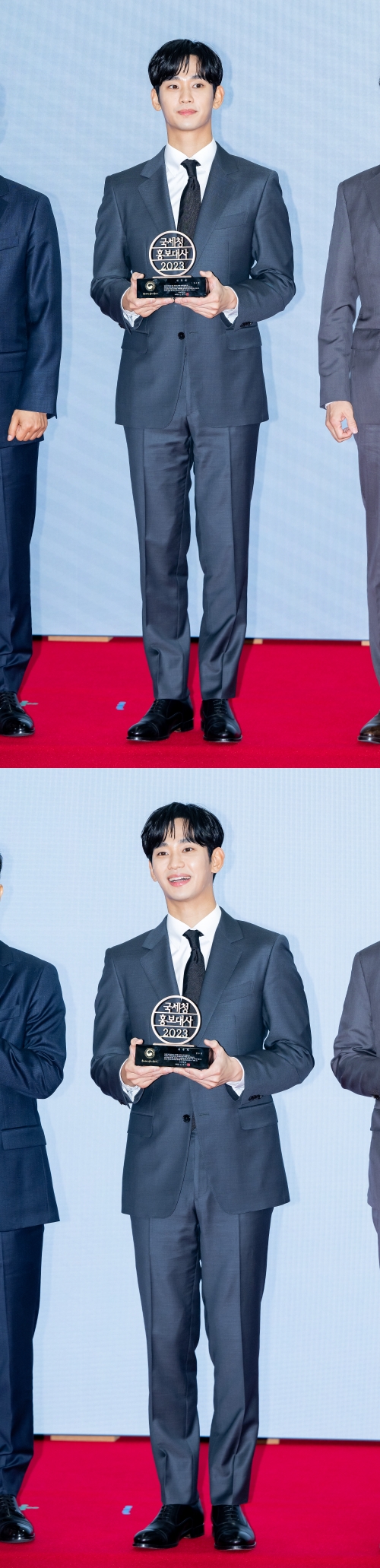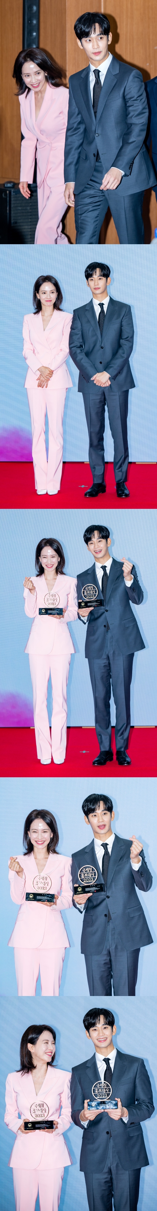 キム・スヒョンとソン・ジヒョは、それぞれグレーとピンクの爽やかなスーツルックで登場。トロフィーを持ちながらさまざまなポーズを決めた。