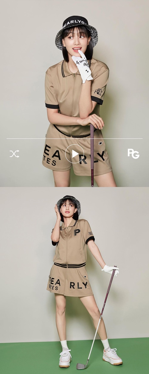 写真を見ると、ベージュを基調としたゴルフウェアを着用し、バケットハットを被ったジヒョがカメラに向かってポーズを見せている。