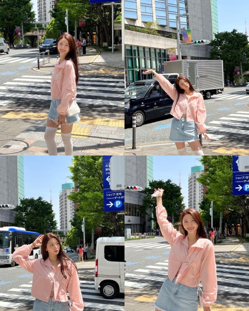 白のクロップドトップスにデニムスカート、ピンクのブルゾンを羽織った春らしいコーディネートを披露している。