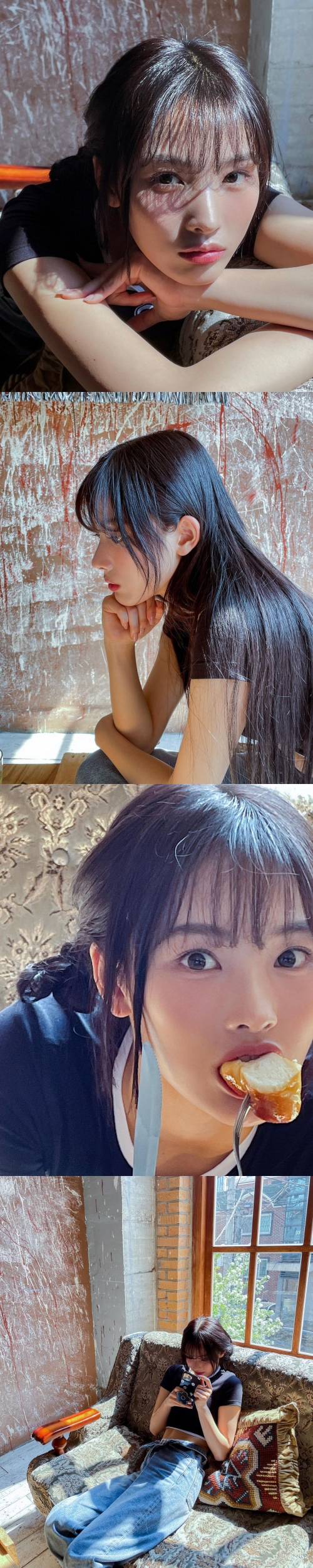 別のカットでは、何かを考えるような仕草をする様子やベーグルを頬張るお茶目な姿まで、さまざまな魅力を発揮した。