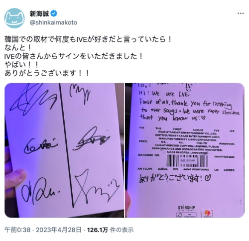 新海誠監督、ファン公言したIVEからサインをプレゼントされる「こんなことがあって良いのか」【PHOTO】