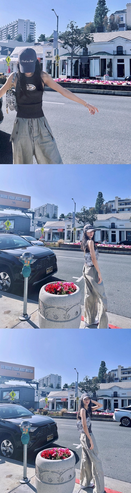 写真に写ったジスは、タンクトップにワイドパンツ、キャップを合わせたカジュアルな格好でLAの街を満喫している様子。くっきりとした目鼻立ちと抜群のスタイルが見る人の感嘆を誘っている。