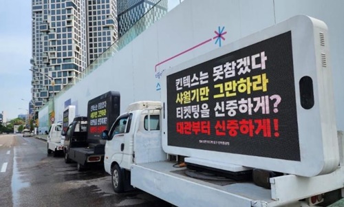 SHINeeの一部ファンらは1日、ソウルに位置する所属事務所SMエンターテインメント前でトラックデモを実施。現場には3台のトラックが動員され、これらには「KINTEXは我慢ならない」「誰のための場所なのか」「すべての席に視野制限」「会場を変更しろ」といった要求が掲載された。