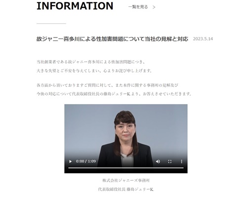 5月14日、同社の現社長である藤島ジュリー景子氏は、1分ほどの短い映像で初めて謝罪した。