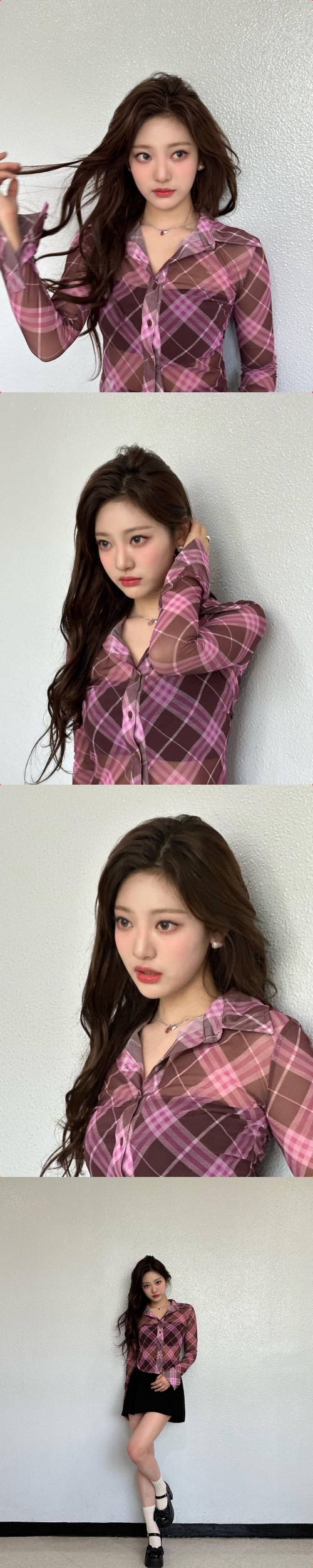 さらに、シースルー素材のピンクのチェックシャツからは黒のブラトップ姿がのぞき、大人びた雰囲気だ。