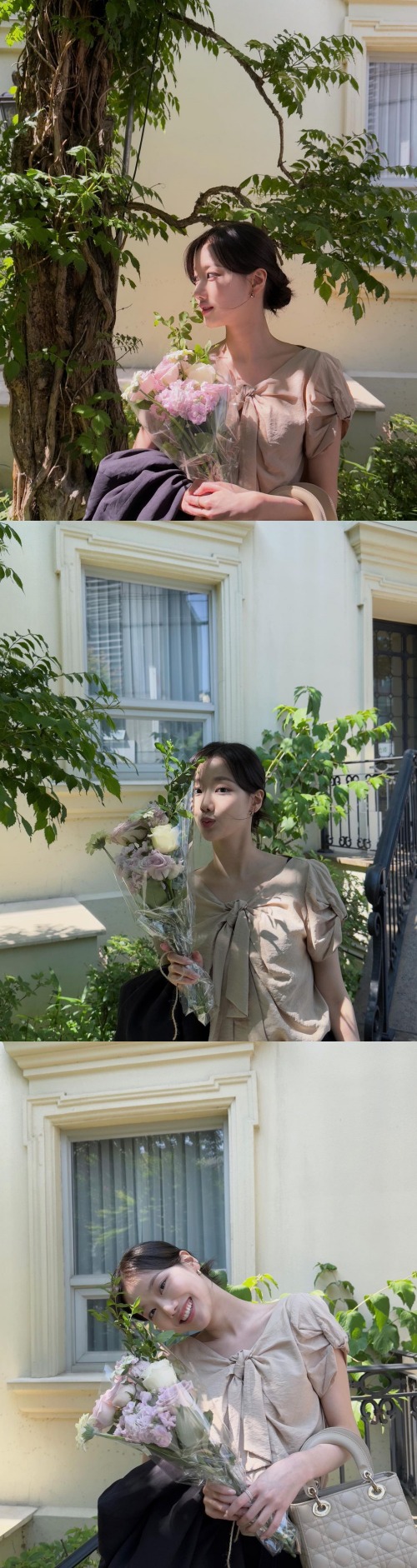 写真には、花を持ったイ・ナウンの姿が。リボンがついたブラウスに小ぶりのピアスで上品な印象を与えた。完璧な横顔や歯を見せた思いっきりの笑顔が目を引く。
