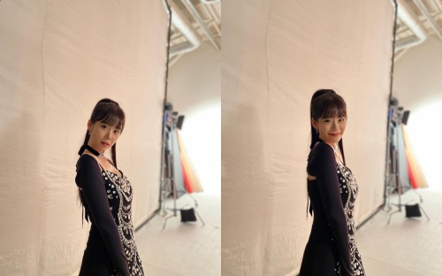 別のカットでは、ポニーテール姿を披露。ビジューのあしらわれた華やかな衣装を身にまとい、首をかしげた愛らしい仕草でファンを虜にした。