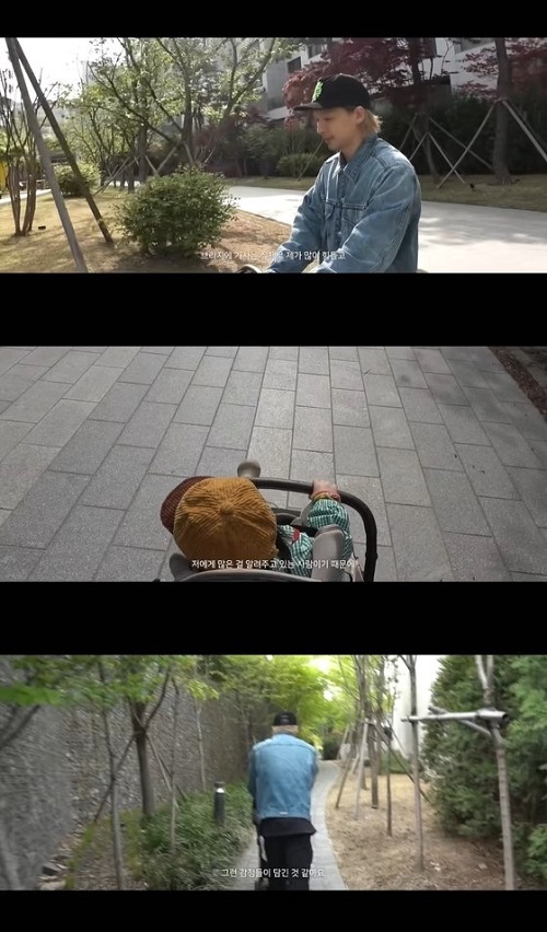 (画像=YouTube)ベビーカーを引くテヤン