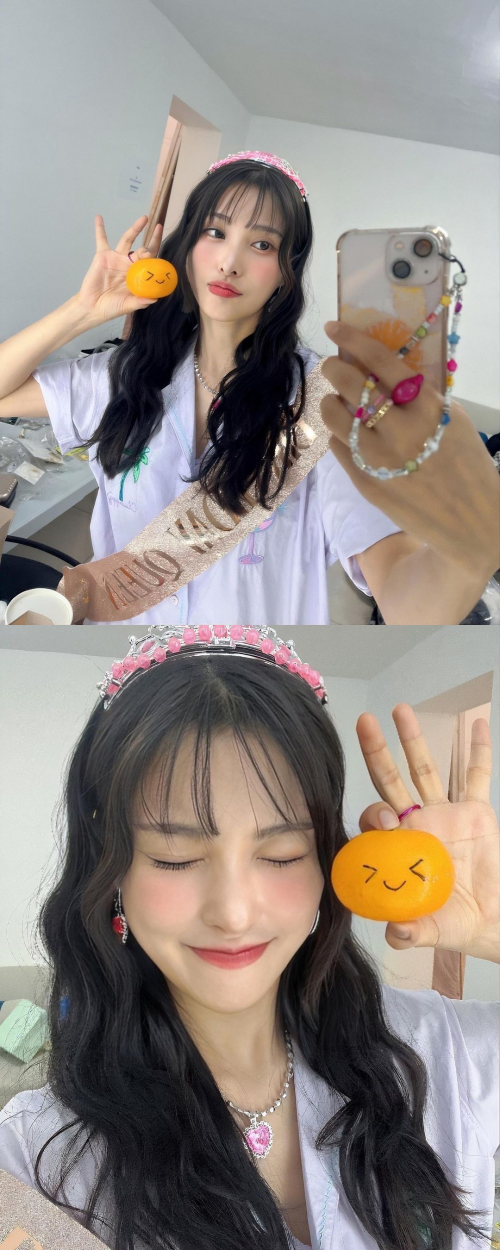 写真には、顔が描かれたミカンと同じ表情のギュリが写っている。ぎゅっと目をつぶったまま、笑うお茶目なギュリ。さらに、別の写真でもミカンを持ち、可愛らしい表情で自撮りをしている。