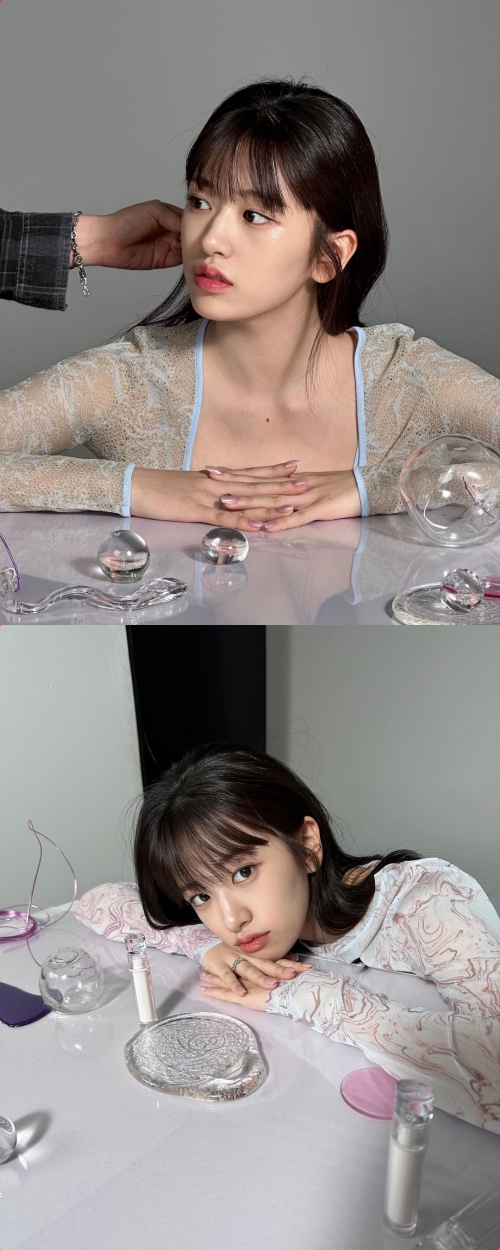 別のカットでは、テーブルにうつ伏せているユジンの姿が。首を傾げて上目遣いする仕草を披露し、見る者のハートを鷲掴みにした。