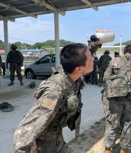 また別の写真には「化生放訓練」を終え、顔に水をかけているJ-HOPEの姿があった。化生放訓練とは、化学・生物兵器および放射能に対応する訓練のこと。特に厳しい訓練のひとつとされる。