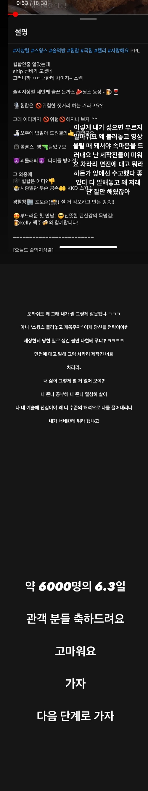 続けて「手伝ってあげたのに、なんだ。私が何をそんなに悪いことしたの。いや、「Swingsを呼んで恥ずかしめてやろう」これがあなたたちの戦略?世の中にやられたことで生じた不満を私に解消するのか?面と向かって言えよむしろ」とし「私の人生がそんなに大したことないように見える?私XX勉強してるよ。私XX一生懸命生きてるよ。私は私の芸術に本気だよ。なぜお前レベルの解釈で私を引きずり下ろすのか。私がお前たちに何か言ったか」と怒りをあらわにした。