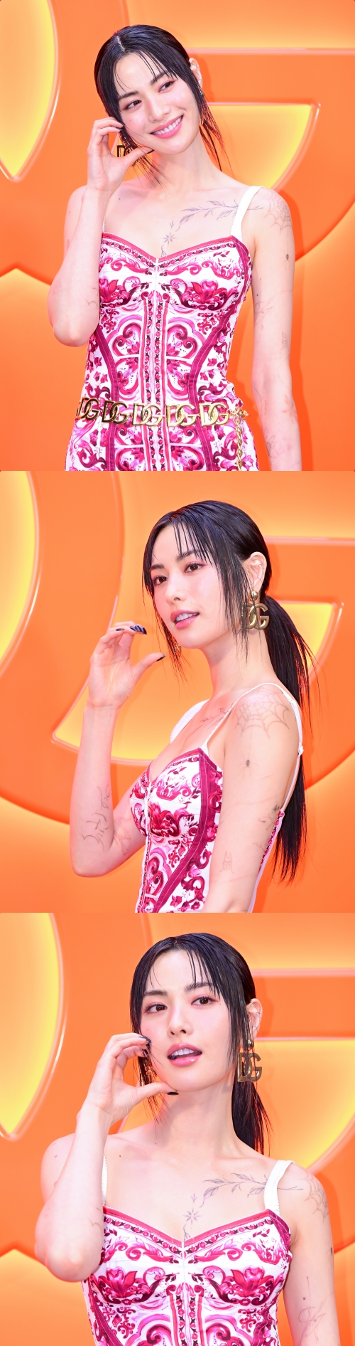 髪は後ろでまとめてすっきりとした印象を与えており、全身に施されたタトゥーも視線を捉えた。