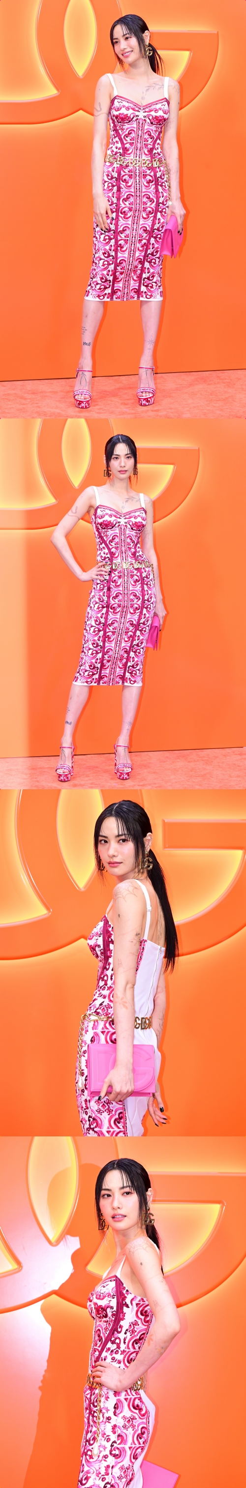 体のラインに沿った華やかなドレスを着用して登場したナナ。バッグからミュールまでピンクで統一した姿は、まるで人形のようだ。