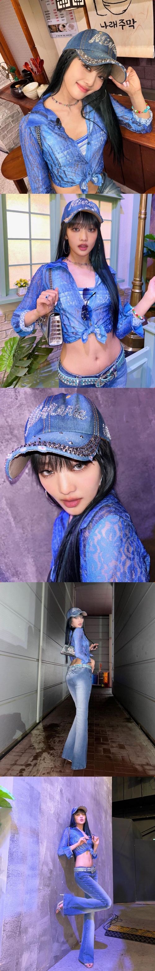 “Y2K(2000年代の流行を取り入れた)ムード”満載のブルーコーデに身を包んでおり、前結びのシャツやくびれの位置が絞られたフレアパンツがミンニのメリハリのある体型を引き立たせている。