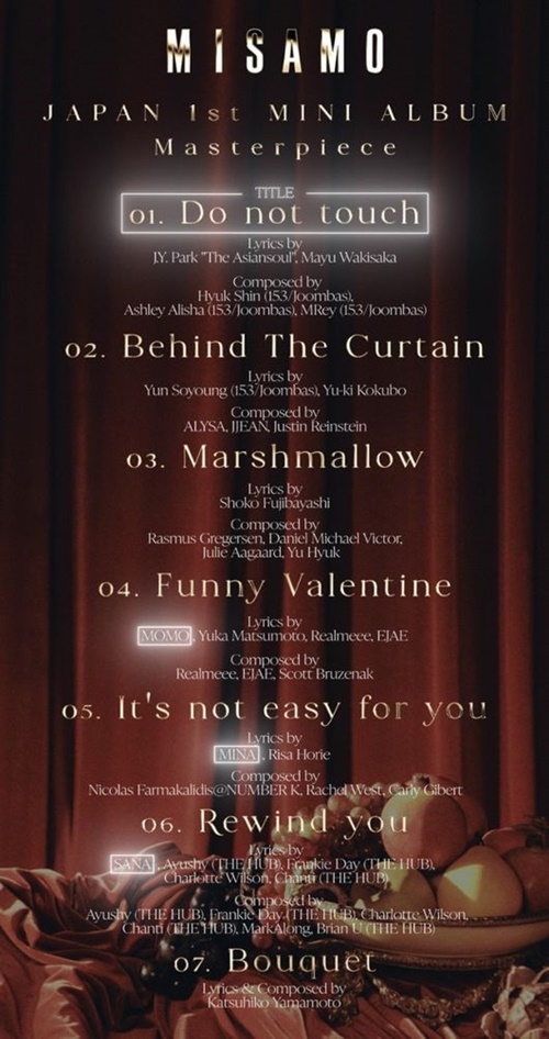『Masterpiece』にはリード曲の『Do not touch』をはじめ、『Behind The Curtain』『Marshmallow』『Funny Valentine』『It's not easy for you』『Rewind The Curtain』『Bouquet』の計7曲が収録される。