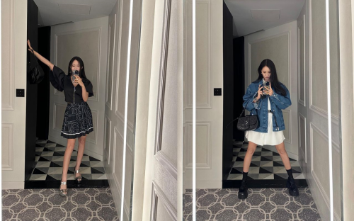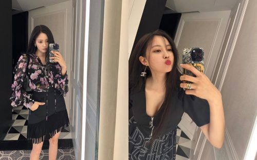 写真には、マカオで開催された「カール・ラガーフェルド」のイベントに参加するために、服を選ぶヒョミンの姿が。人形のようなしなやかな体つきで、花柄のブラウスや個性的なスカート、シャツワンピースなどを着こなした。何よりも、見事な脚線美が目を引く。
