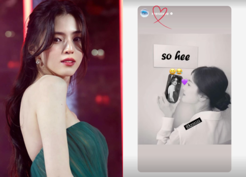 写真のソン・ヘギョは、「so hee」と書かれた立て札の下でハン・ソヒの写真を持ったままポーズを取っている。