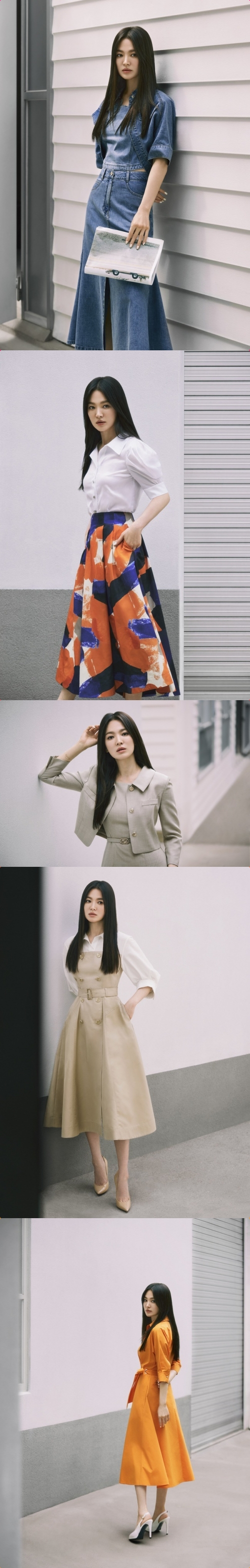 写真の中のソン・ヘギョは、バイカラーが目立つAラインのシャツワンピース、ラグラン袖が特徴的なデニム素材のセットアップなど、さまざまなアイテムをソン・ヘギョらしい高級感あふれる魅力で完璧に着こなした。