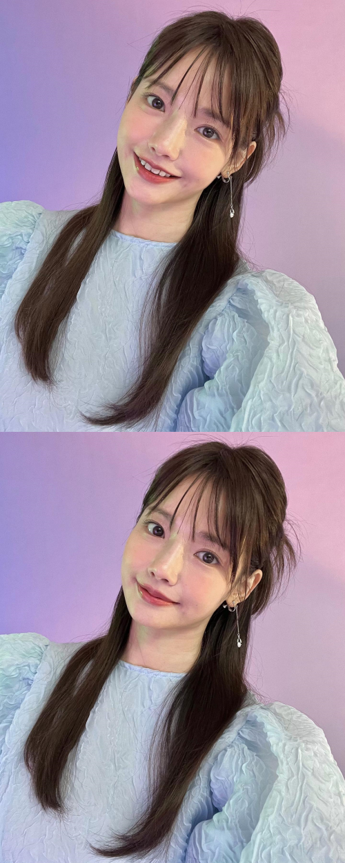 写真には、歯を見せてニコッと笑うハ・ヨンスの姿が。薄い水色のふんわりしたトップスとゆらゆら揺れるピアスが、女性らしさを増幅させる。ナチュラルメイクと、きめすぎない髪型でハ・ヨンスの魅力を引き立たせた。