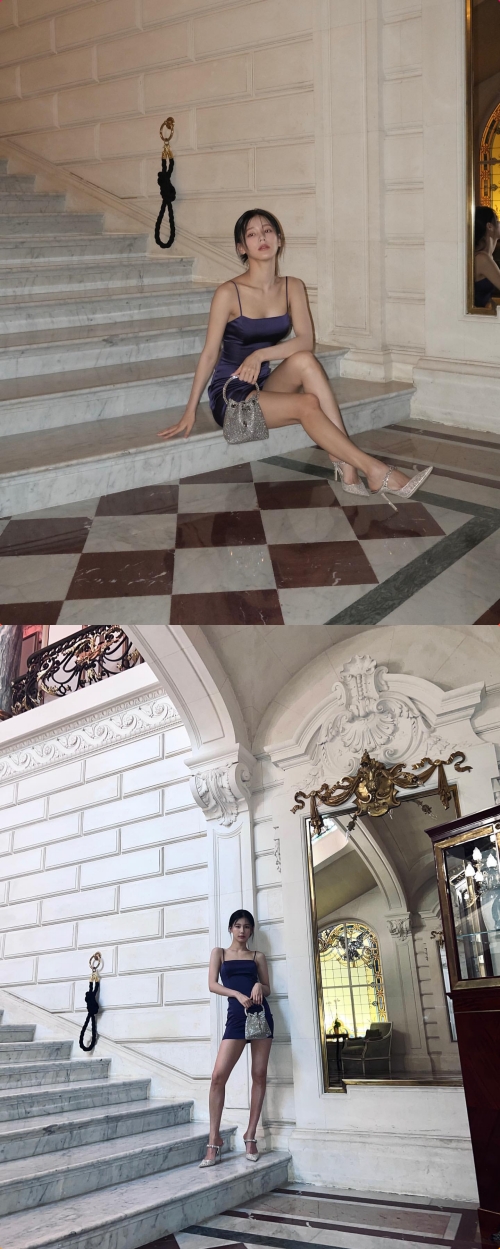 階段に座ったりポーズを決めたりしてミニ丈のシルクドレスから伸びる美脚を見せつけており、雑誌の1ページのようなビジュアルを誇っている。