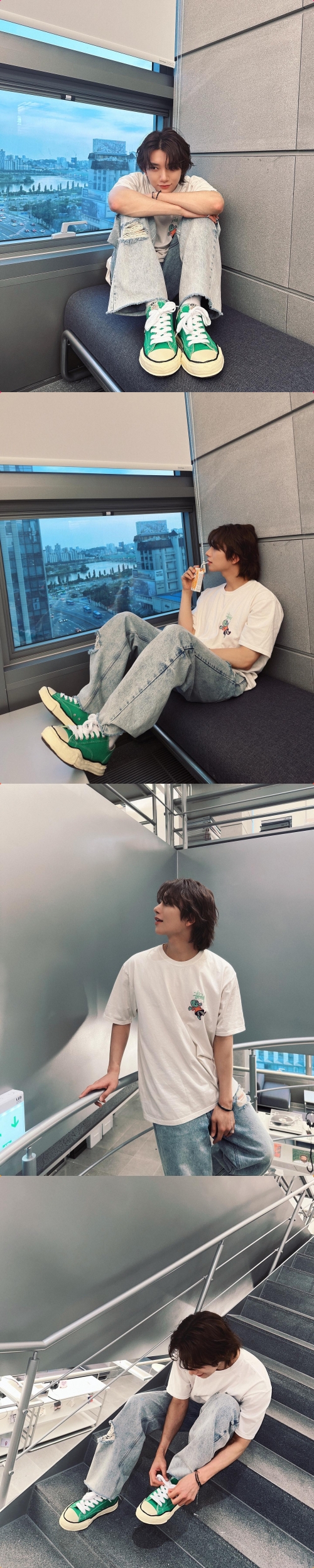 ジョシュアは胸元にイラストがプリントされたTシャツにデニム、スニーカーというカジュアルな装い。窓に映る外の景色を眺めながら彫刻のような美しい横顔を披露し、ファンの心を刺激した。