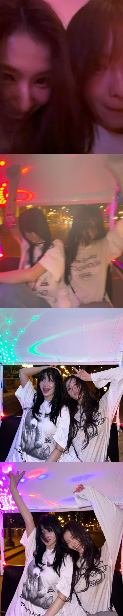写真をのぞくと、自動車の後部座席にてBGMに合わせてノリノリに踊る2人の様子が収められている。