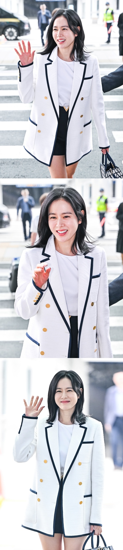 全身「VALENTINO」コーデで登場したソン・イェジン。ショートパンツからは自慢の美脚がすらりと伸びている。出産から1年も経っていないにもかかわらず、抜群のスタイルが目を引く。