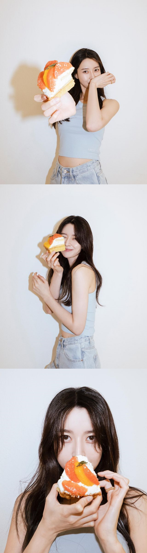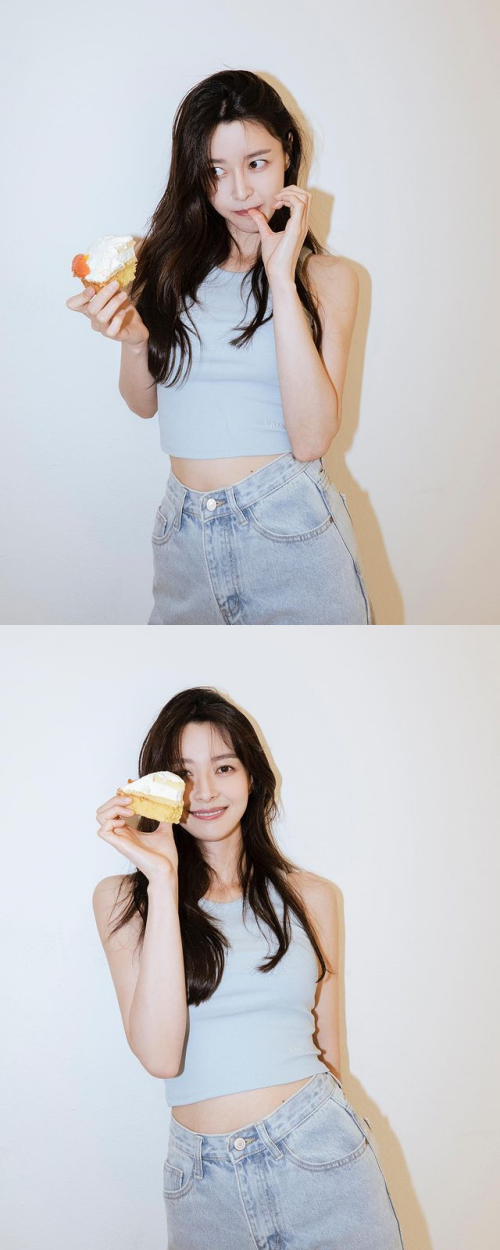 写真のクォン・ナラは、クロップドトップスにジーンズを合わせた。シンプルな装いがクォン・ナラの美しさと薄さをより際立たせる。ウインクをしたり、指をペロッとしたり、ケーキを食べているだけでも色香が放たれた。