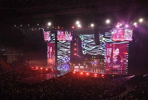 コンサート会場に入場すると、デビュー2年目の新人グループLE SSERAFIM(ルセラフィム)と31年目の貫禄の歌手オム・ジョンファがひとつの舞台に上がる珍しい風景が繰り広げられる。