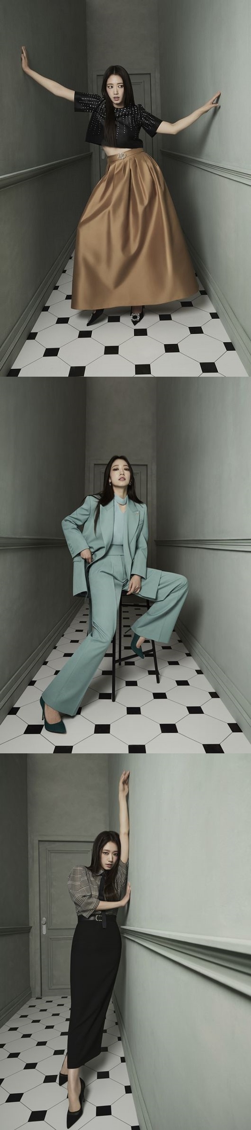 彼女はブラックのスカートにチェックパターンの上着をマッチさせ、高級感のある姿を披露したかと思えば、また別の写真ではモダンで美しい雰囲気を演出して目を引いた。