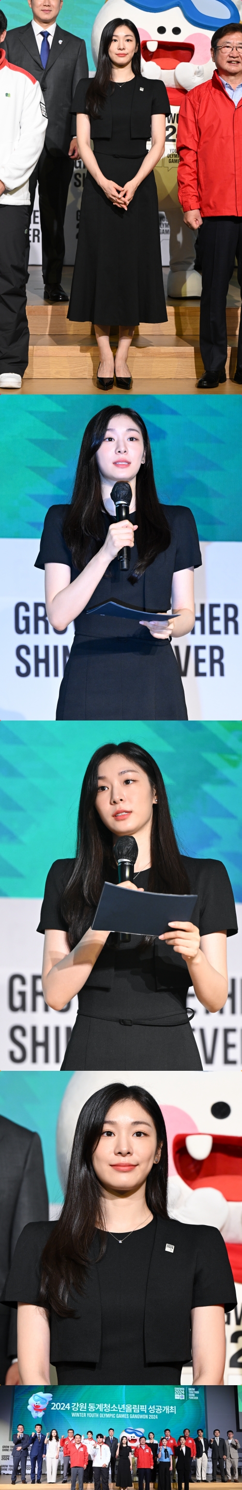 シックな黒のセットアップ姿で登場したキム・ヨナは相変わらずの美貌を放ち、見る者の視線を捉えた。