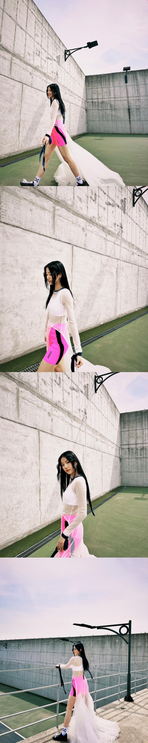 さらに、ブラトップに蛍光ピンクのバイカーパンツを着用し、シースルー衣装を合わせることでヘルシーなレイヤードスタイルを完成させている。