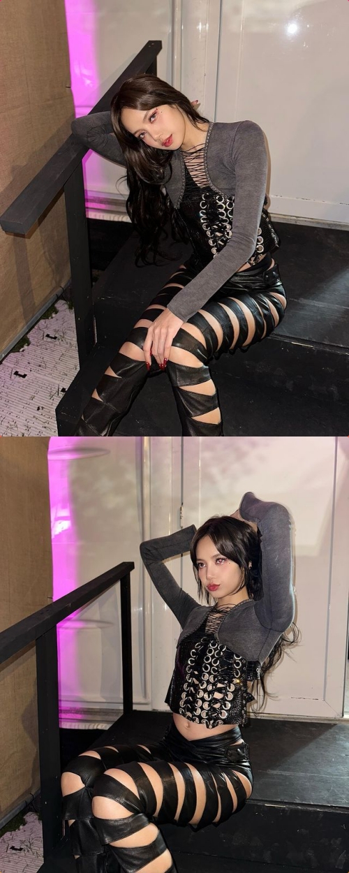 写真のリサは、腰から足首まで包帯をぐるぐる巻いたような奇抜なデザインの黒いパンツに、クロップド丈のカーディガンを羽織り、艶やかな魅力を放っている。