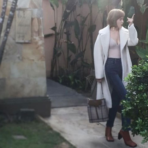 写真の中には、深いVネックのトップスにコートをまとった彼女の姿が写っている。すらりとしたボディラインと対比されるボリューム感が印象的だ。