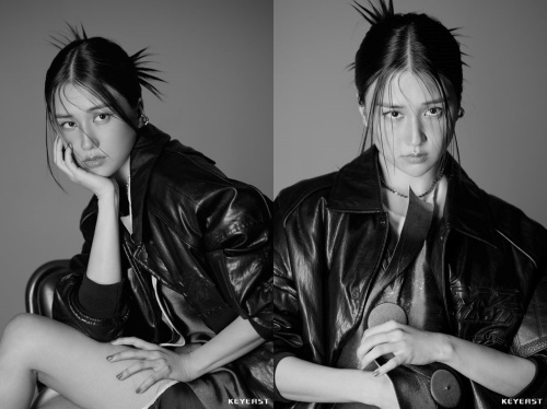 別の写真では黒い革ジャンを羽織り、破格的なスタイリングでパク・ハソンの大胆でシックな目つきと表情を感じさせる。