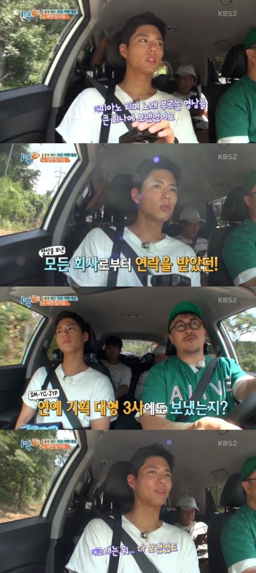 ラッパーのデフコンが「SM、YG、JYPにも送ったのか」と質問すると、パク・ボゴムは「その時は全て送った」と答えた。