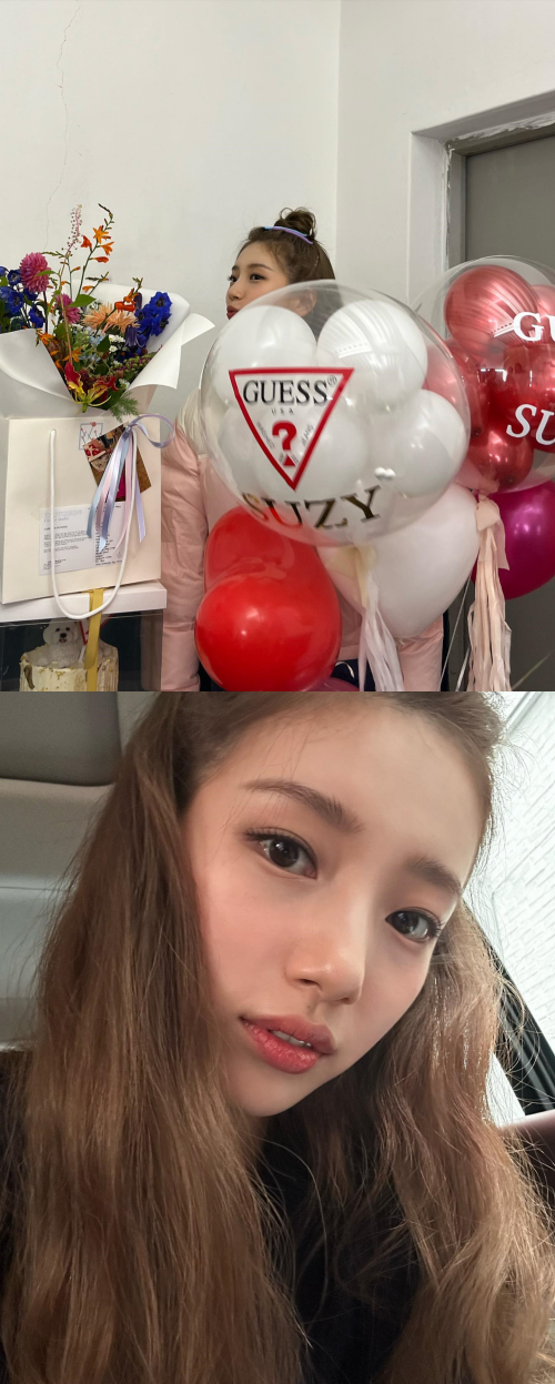 写真には近距離で撮ったオールバック姿のスジが。丸いおでこと艶のある美肌が目を引く。別の写真では自身がモデルを務める「GUESS」からもらった風船や花束に囲まれたスジが、ひょこっと出ており、お茶目な姿を見せている。