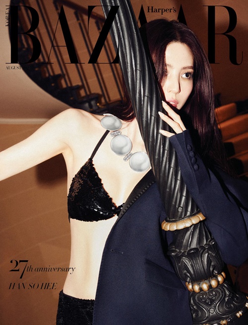 先行公開された8月号のカバーフォトで、ハン・ソヒは銀色のボールドなジュエリーをネックレスとヘアピンで着用し、独特な雰囲気を発散した。ランジェリー風の衣装とワインカラーのストッキングまで強烈なイメージ変身が目を引く。