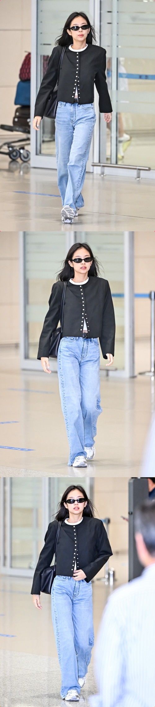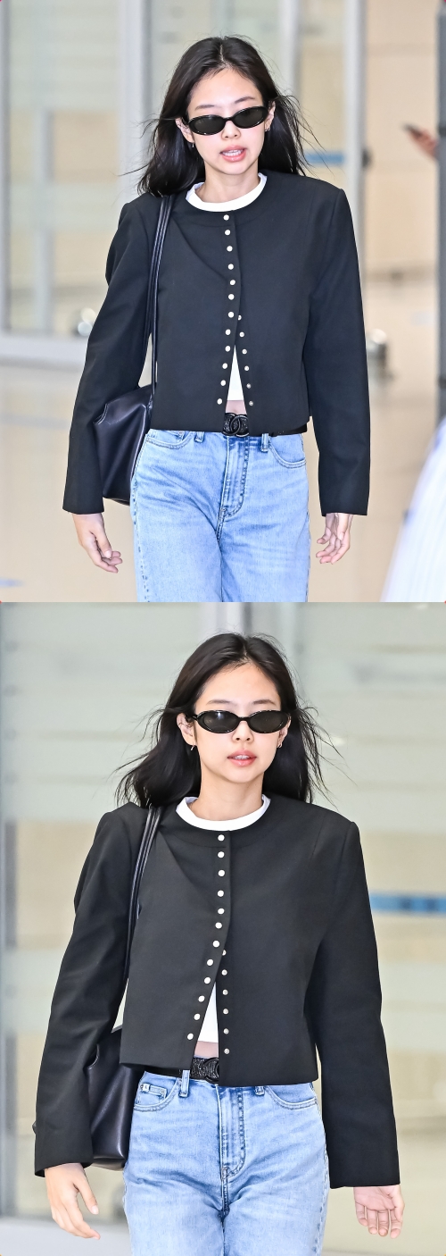 ジェニーは白Tシャツに黒のボレロを羽織り、デニムを合わせたスタイリッシュな装い。サングラスをかけてもその美貌とオーラは健在だ。