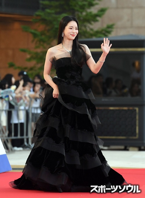 『ザ・グローリー~輝かしき復讐~』に続き、『庭のある家』(原題)まで相次いで大ヒットさせている女優イム・ジヨンも、ブラックドレスを選択。重く見えがちなブラックドレスに、豊かなラッフルで軽快さを加えた。