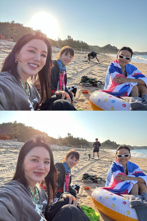写真にはバラエティ番組『ダンス歌手流浪団』(原題)で共演中のイ・ヒョリとキム・ワンソンとともに、海で楽しいひとときを過ごすオム・ジョンファの姿が。にこっと笑う3人の姿からは仲の良さが伝わる。