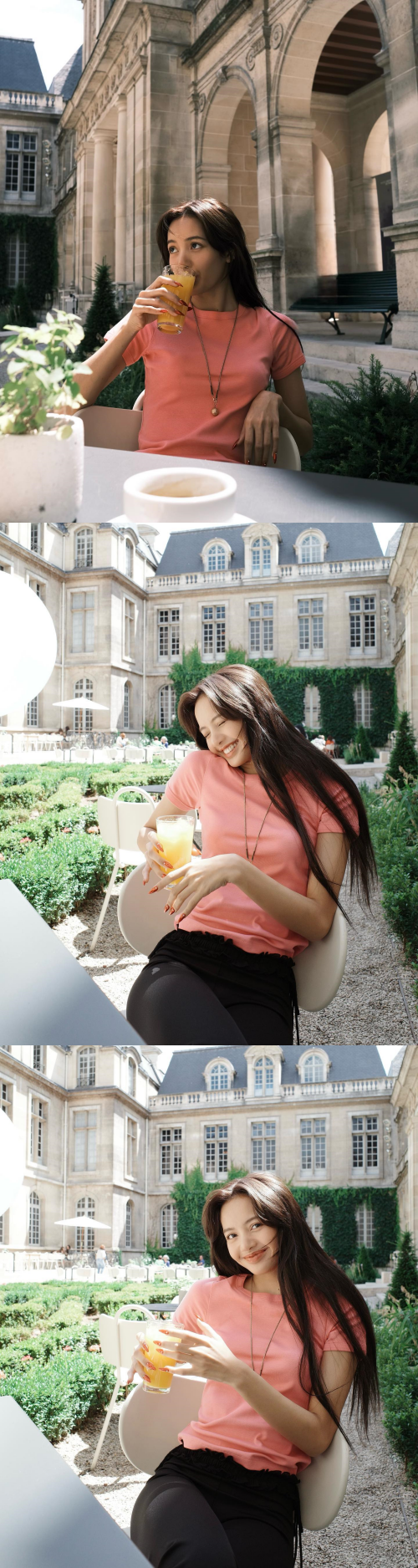 写真には、広いテラス席で優雅なひと時を過ごすリサの姿が。セットしていない髪の毛に化粧していないナチュラルな姿で、満面の笑みを見せたリサ。唇を突き出して、お茶目な一面も見せている。
