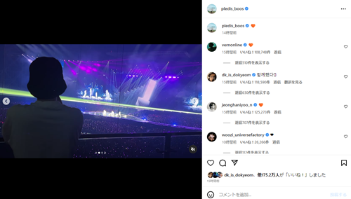 今回の投稿には、ファンだけでなくメンバーらもコメントを残している。バーノン、ジョンハン、ウジはハートの絵文字をコメント欄に残し、DK(ドギョム)は「一緒だったよ」と心温まるメッセージを投稿している。