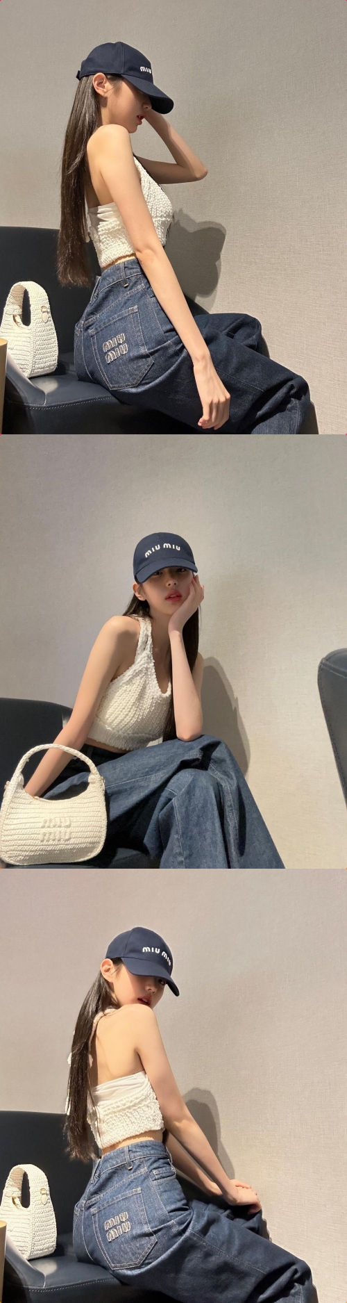 写真の中のウォニョンは、白いニットのキャミソールとワイドジーンズを合わせて、モダンなサマールックを完成させている。