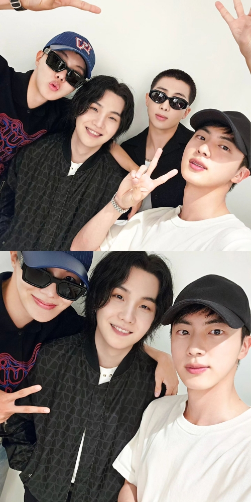 JINは8月6日、自身のインスタグラムに2枚の写真をアップ。「バンタン愛してるARMY愛してる」「かっこいいSUGA」というキャプションが添えられた写真には、JIN、SUGA、J-HOPE、RMの姿が収められている。